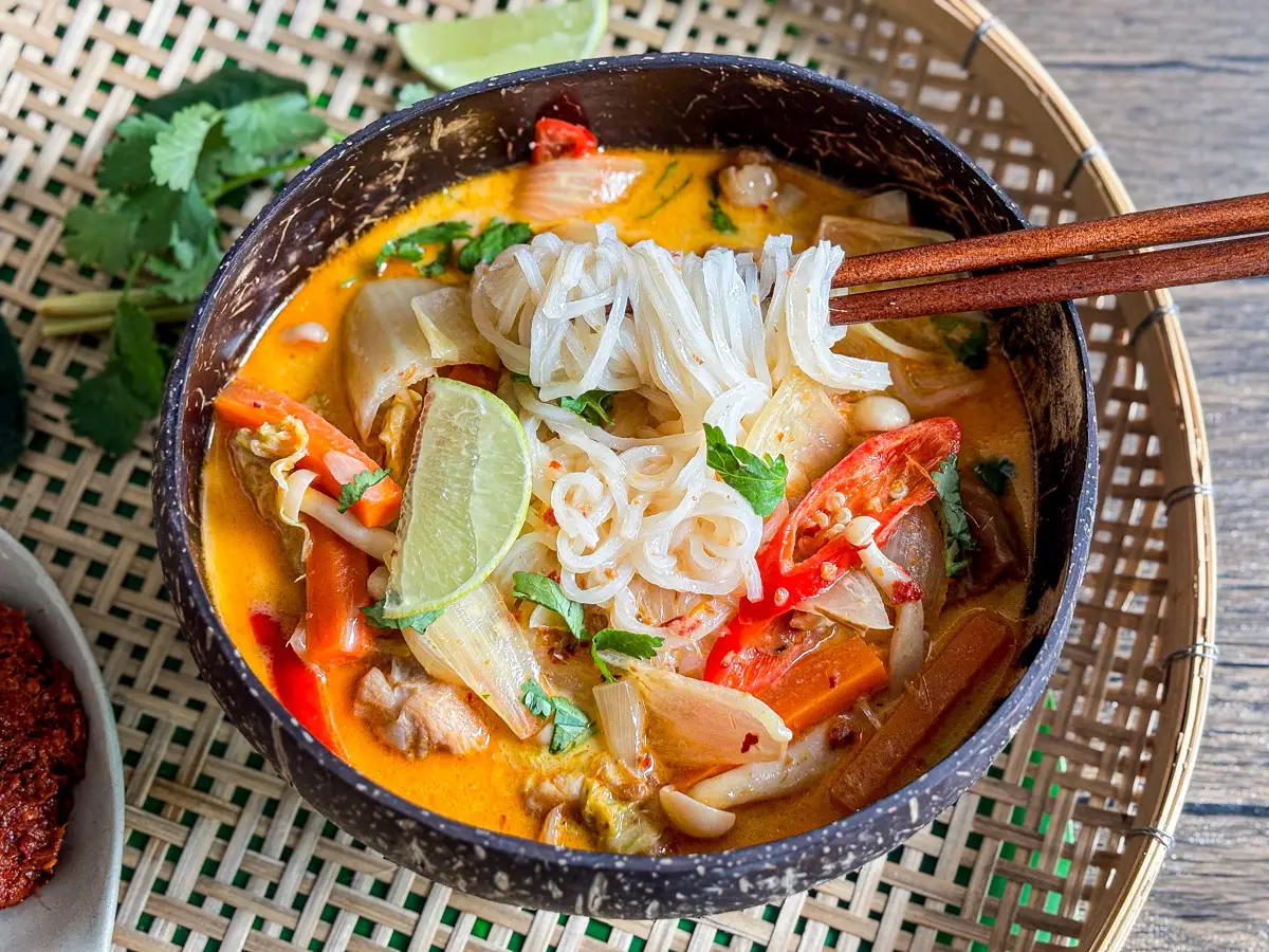 A sopa de macarrão de curry vermelho combina leite de coco com pasta de curry vermelha, macarrão de arroz, frango, legumes e um pouco de chuva para obter uma consistência semelhante à sopa. O sabor é picante, cremoso e equilibrado, com mel e salinidade, com açúcar de palma e molho de peixe.